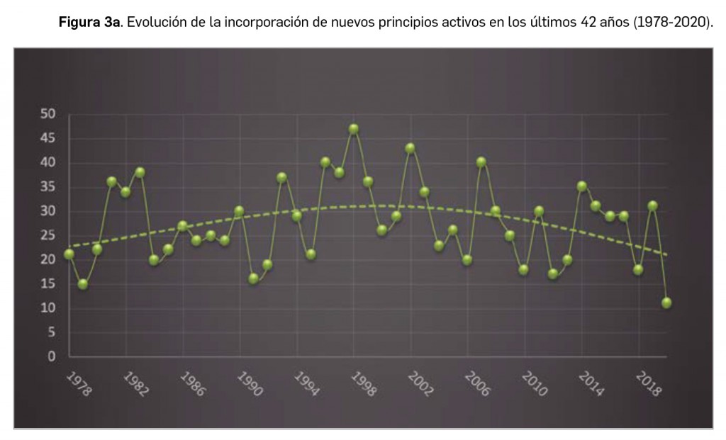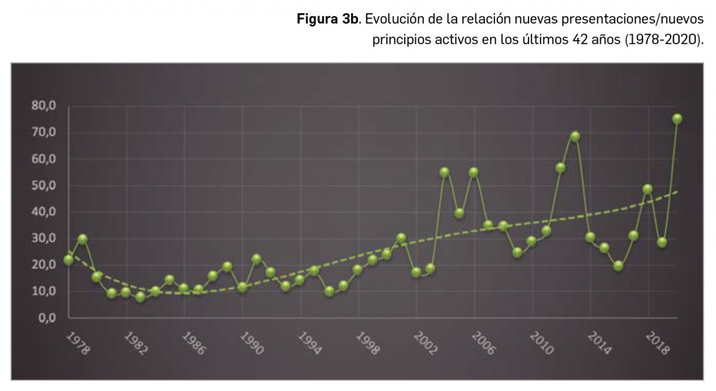 A grandes rasgos, las tendencias de la incorporación de nuevos principios activos en los últimos 42 años (1978-2020) (Figura 3a) y de la relación nuevas presentaciones/nuevos principios activos (Figura 3b) son moderadamente fluctuantes2. Si bien en los últimos 10 años se aprecia una ligera estabilización en la incorporación de nuevos principios activos en el mercado español (Figura 3c), ésta ha sido interrumpida por el citado año: 2020 ha sido el año en el que se ha producido la menor comercialización de principios activos nuevos desde que se tienen registros en PAM (y, por ello mismo, el año en que la relación global nuevas presentaciones/nuevos principios activos ha adquirido el valor más alto de la serie histórica).