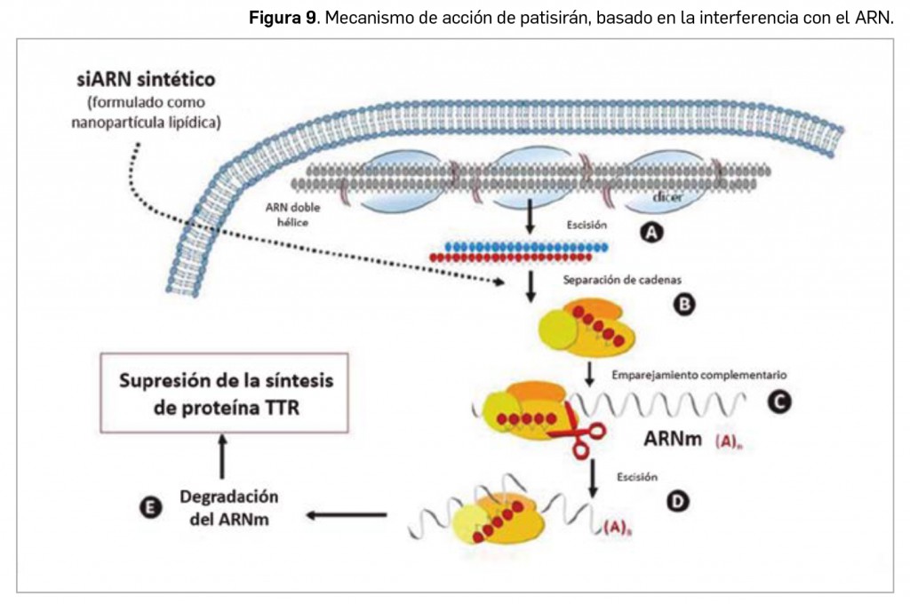 Inotersén es un oligonucleótido antisentido diseñado para su unión selectiva a la región no traducida en 3’ del ARNm de la transtiretina (TTR) humana, tanto de tipo mutante como normal o salvaje, y provoca su degradación a través de la escisión mediada por la RNAsa H1. Por su parte, patisirán es el primer ARN de interferencia autorizado en Europa (Figura 9): un ARN bicatenario pequeño formulado en nanopartículas lipídicas que se une específicamente a una secuencia conservada en la región 3’-UTR del ARNm de la TTR, también tanto en su forma mutante como salvaje, y a través de la interferencia de ARN y con mediación de la endonucleasa argonauta-2, produce la degradación catalítica de dicho ARNm. En consecuencia, ambos fármacos inhiben la síntesis hepática y la secreción a sangre de la proteína TTR, reduciendo de forma sustancial sus niveles séricos circulantes, lo que se traduce en una mayor estabilización o aclaramiento de los depósitos de TTR amiloidótica y de las manifestaciones de la polineuropatía. Designados por la EMA como medicamentos huérfanos, ambos han sido autorizados para el tratamiento de la polineuropatía en estadios 1 o 2 en pacientes adultos con amiloidosis familiar (o hereditaria) por transtiretina (ATTRh). Inotersén se administra por vía subcutánea una vez por semana y patisirán por vía intravenosa una vez cada 3 semanas.