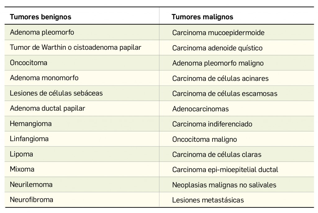 El 80% de los tumores de las glándulas salivales se localizan en la parótida (la mayoría de ellos en la cola de la glándula o en el lóbulo superficial), el 10% tiene localización submaxilar y el otro 10% restante corresponden al resto de las glándulas. Afortunadamente, son benignos un 80% de los tumores parotídeos, 70% de los submaxilares y 50% de los de glándulas salivales menores (localizados éstos más frecuentemente en el paladar), si bien la mayoría de los tumores de la glándula sublingual son malignos. Se cumple la regla de que, según disminuye el tamaño de la glándula, aumentan las probabilidades de malignidad del tumor.