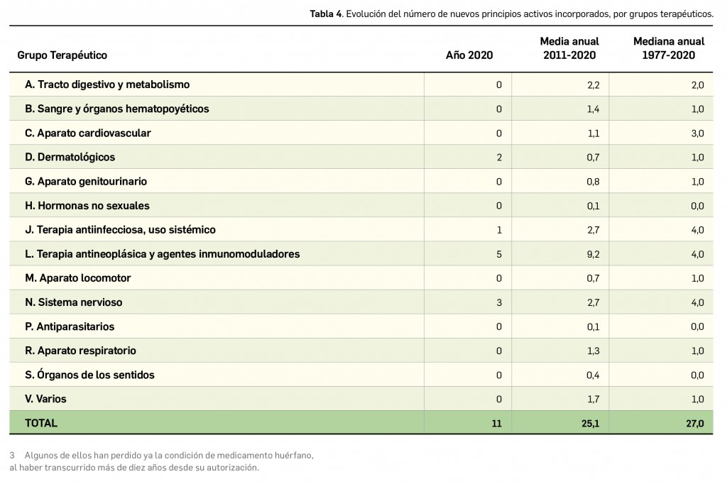 Si se considera la clasificación terapéutica ATC de los nuevos principios activos comercializados en 2020, se han incorporado principios activos a 4 de los 14 grupos terapéuticos existentes. El grupo con mayor número de nuevos principios activos durante el año ha sido, como ya venía ocurriendo en los últimos años, el grupo L (Terapia antineoplásica y agentes inmunomoduladores), con un total de 5.