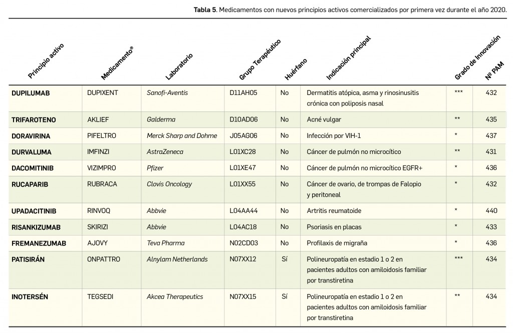 En cuanto al grado de innovación terapéutica, destaca sobremanera la comercialización –y financiación– en España de dos principios activos nuevos: dupilumab, un anticuerpo monoclonal frente a la subunidad α del receptor de la IL-4, que representa el primer tratamiento específicamente dirigido a contrarrestar la inflamación tipo 2 mediada por células Th2, inaugurando una prometedora vía terapéutica en dermatitis atópica y asma; y patisirán, el primer ARN pequeño de interferencia autorizado –en un medicamento huérfano– para el tratamiento de una enfermedad en humanos (la polineuropatía en adultos con amiloidosis familiar por transtiretina), y que se erige como cabeza de serie de una vasta clase de fármacos con gran potencial en diversas enfermedades; el primero de ellos fue merecedor del Premio Panorama 2020, y patisirán recibió una Mención de Honor en los citados galardones. Pero éstos no han sido los únicos, habiéndose comercializado también interesantes medicamentos frente al cáncer de pulmón no microcítico o el acné, entre otras patologías. Las principales características farmacoclínicas de todos los nuevos principios activos de 2020 se resumen en el presente artículo.