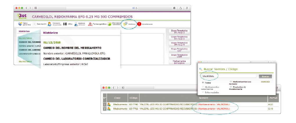 Además de la información que se incluye en los listados mensuales publicados en PAM, en BOT PLUS se incluye un apartado de Histórico, en las fichas de medicamentos, en el que se presenta información referente a cambios que haya sufrido anteriormente el medicamento o producto, entre otros, los cambios de nombre y los cambios de laboratorio. Esta información también está disponible para productos sanitarios financiados o dietoterápicos.