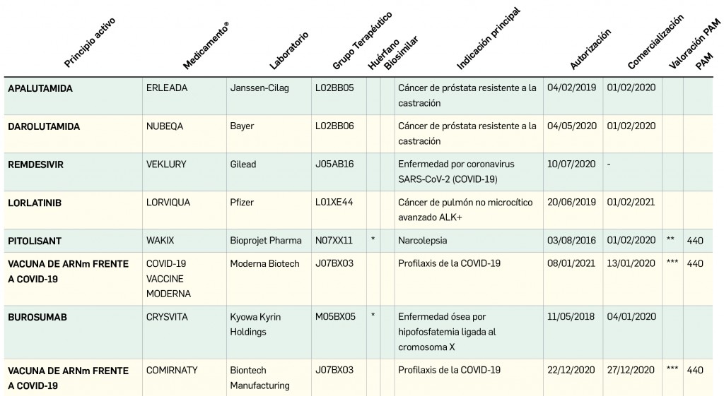 Como viene siendo habitual, inauguramos el primer número anual de PAM con un resumen de todos los medicamentos con nuevos principios activos comercializados por primera vez en España en el año previo. En comparación con los anteriores, el difícil 2020 ha sido un año menos prolífico en cuanto a la incorporación al arsenal terapéutico de innovaciones farmacológicas, habiéndose comercializado un total de 11 nuevos principios activos, 20 menos que en el año anterior; casi la mitad de ellos (5) se enmarcan dentro del grupo terapéutico ATC L (terapia antineoplásica y agentes inmunomoduladores), continuando con la tendencia del último lustro en que la mayor parte de los nuevos principios activos se dirigen al tratamiento de patologías oncológicas o de naturaleza autoinmune. En 2020, solo se han comercializado 2 nuevos principios activos en medicamentos designados como huérfanos.