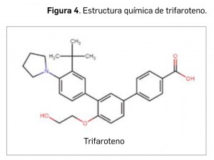 El trifaroteno es un nuevo derivado de retinoide de cuarta generación (Figura 4) que actúa como un potente agonista del receptor γ del ácido retinoico (RARγ), con una especificidad muy elevada y una afinidad 50 veces mayor que sobre RARα y 8 veces mayor que sobre RARβ; no presenta, en cambio, actividad sobre receptores X de retinoides (RXR). Así, puesto que los RARγ son los receptores de retinoides más abundantes en la piel, trifaroteno será capaz de modular la expresión de genes diana implicados en el crecimiento y la diferenciación celular, la respuesta al estrés, cascadas antiinflamatorias y la apoptosis, entre otros procesos. Si bien el mecanismo exacto por el cual mejora el acné no se conoce completamente, el medicamento ha sido autorizado para el tratamiento (por vía tópica en forma de crema) de acné vulgar en la cara, en el pecho y/o en la espalda en pacientes mayores de 12 años, en presencia de numerosos comedones, pápulas y pústulas.