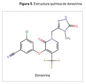 Doravirina es un nuevo inhibidor de la enzima transcriptasa inversa del VIH-1 de tipo no nucleosídico (ITINN) (Figura 5) que inhibe de forma potente la replicación del virus en la célula hospedadora. Se une específicamente a la enzima viral de forma no competitiva (en una zona cercana pero diferente del centro catalítico de la enzima, usado por los ITIAN) y sin incorporarse a la cadena de ADN viral en formación, pero no inhibe las ADN polimerasas celulares α, ß ni la ADN polimerasa γ mitocondrial del ser humano. En base a ello, el medicamento ha sido autorizado, en combinación con otros medicamentos antirretrovirales, para el tratamiento por vía oral de adultos infectados por el VIH-1 sin evidencia pasada o presente de resistencia a otros ITINN.