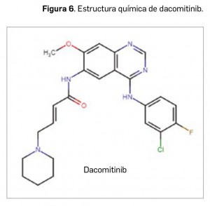 Dacomitinib es un nuevo antineoplásico (Figura 6) que actúa como inhibidor universal, selectivo, irreversible y competitivo con el ATP, del dominio tirosina cinasa del receptor del factor de crecimiento epidérmico humano (EGFR/HER1, pero también de HER2 y HER4), con actividad contra el EGFR mutado con deleciones en el exón 19 o la sustitución L858R en el exón 21. En base a ello, atenúa los procesos de crecimiento celular neoplásico (incluyendo, entre otros, la proliferación celular incontrolada, la migración celular, la invasión del estroma, la angiogénesis y la resistencia a la apoptosis), por lo que el medicamento ha sido autorizado, en monoterapia, para el tratamiento por vía oral de primera línea de pacientes adultos con cáncer de pulmón no microcítico (CPNM) localmente avanzado o metastásico con mutaciones activadoras del EGFR.