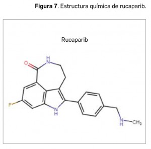 El rucaparib (Figura 7) es un nuevo inhibidor selectivo de poli-ADP-ribosa polimerasas (PARP-1, -2 y -3), enzimas implicadas en los mecanismos de reparación del ADN, tanto en células normales como tumorales: mediante su inhibición, la citotoxicidad de rucaparib –que ha demostrado ser independiente de la presencia de mutaciones en los genes BRCA– se debe a un aumento de la formación de complejos PARP-ADN, conducente a un daño del ADN y a la activación de la apoptosis y la muerte celular. Por ello, el medicamento ha sido autorizado en el tratamiento de mantenimiento, en monoterapia, de pacientes adultas con cáncer de ovario epitelial, de trompa de Falopio o peritoneal primario, de alto grado, en recidiva, sensible al platino, que responde completa o parcialmente a la quimioterapia con platino. También está indicado en monoterapia para el tratamiento de pacientes adultas con cáncer de ovario epitelial, de trompa de Falopio o peritoneal primario, de alto grado, con mutación BRCA (germinal y/o somática), sensible al platino, en recaída o progresión, que hayan sido tratadas con dos o más líneas previas de quimioterapia con platino y que no son capaces de tolerar más quimioterapia a base de platino.