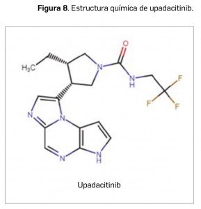 Upadacitinib es un nuevo inmunosupresor activo por vía oral que actúa mediante la inhibición selectiva y reversible de las cinasas Janus o JAK, preferentemente sobre las JAK-1 o JAK-1/3, de manera que modula la respuesta inflamatoria e inmunitaria mediada por citocinas o factores de crecimiento. Estrechamente relacionado (Figura 8) con otros dos inhibidores orales de JAK previamente comercializados en España (tofacitinib y baricitinib), en base a dicho efecto farmacológico el medicamento ha sido autorizado para el tratamiento de la artritis reumatoide (AR) activa de moderada a grave en pacientes adultos con respuesta inadecuada o intolerancia a uno o más fármacos antirreumáticos modificadores de la enfermedad (FAME), pudiendo ser empleado en monoterapia o en combinación con metotrexato.