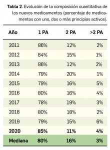 (Tabla 3), 20 menos que el año pasado, lo que representa un número significativamente inferior a la mediana de 29 nuevos principios activos/año correspondiente a la década 2011-2020 (el promedio de nuevos principios activos/año se sitúa en 25,1). Teniendo en cuenta que se han comercializado1 un total de 827 formatos de medicamentos en 2020, se obtiene un promedio de 75,2 presentaciones nuevas de medicamentos por cada nuevo principio activo comercializado1, ampliamente superior a la mediana de la década (30,6). En este sentido, cabe destacar que el 98% de los nuevos medicamentos comercializados durante 2020 incluyeron principios activos autorizados y comercializados en años previos; de ellos, un 2% son presentaciones novedosas de medicamentos ya comercializados previamente, entendiendo como tal aquellas que suponen una innovación en forma farmacéutica y/o vía de administración.