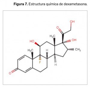 Dexametasona (Figura 7) es un glucocorticoide fluorado de uso común desde la década de 1960 para tratar una amplia gama de afecciones con componente inflamatorio y autoinmune –entre ellas, artritis reumatoide, asma o procesos alérgicos o neoplásicos–, por sus propiedades antiinflamatorias, inmunosupresoras y antialérgicas, y su casi nula actividad mineralocorticoide. Está disponible en España en numerosas presentaciones de medicamentos para diversas vías de administración, siendo su perfil de seguridad no desdeñable, pero bien conocido (caracterizado por frecuentes eventos adversos tales como: susceptibilidad aumentada a las infecciones, candidiasis orofaríngea, hiperglucemia, osteoporosis, cataratas, insuficiencia adrenocortical e inducción de síntomas parecidos al síndrome de Cushing, etc.). La indicación autorizada para su uso en “COVID-19 en pacientes de ≥ 12 años y ≥ 40 kg que requieran oxígeno suplementario” ha sido incluido en la ficha técnica de varios medicamentos. No se ha probado, sin embargo, su beneficio en aquellos pacientes con enfermedad leve-moderada (una mayoría).