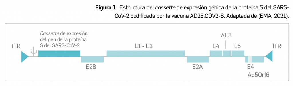 El vector adenoviral consiste en viriones no envueltos de entre 80-100 nm de diámetro, en los que la molécula de ADN linear de aproximadamente 35.000 pares de bases se encapsula en una estructura icosaédrica formada por siete proteínas estructurales, llamadas proteína II (hexon), III (penton), IV (fibre), VI, VIII, IX y IIIa, y cuatro proteínas centrales (V, VII, X y la proteína terminal) que están directamente asociadas con la molécula de ADN. El transgén contenido en la región ΔE1A/E1B del vector adenoviral (Figura 1) codifica para una proteína S de cadena completa, modificada para incluir mutaciones estabilizadoras en la conformación prefusión, tales como 2 cambios de aminoácidos en la zona de unión de las subunidades S1 y S2 (que eliminan el sitio de escisión por furina) y dos sustituciones de prolina en la región bisagra de la proteína.