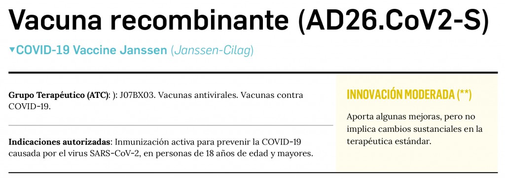 En definitiva, en el actual contexto de pandemia, con la aparición de nuevas variantes virales y la necesidad de disponer de suficientes medicamentos profilácticos autorizados, esta vacuna es la primera que se autoriza en pauta de 1 dosis, representando un cierto grado de avance terapéutico en su indicación, si bien no supone una innovación farmacológica disruptiva (el uso de vectores adenovirales no es una estrategia tan novedosa como lo fue el ARNm). Con un perfil de seguridad similar al resto de vacunas aprobadas en la UE, parece que aporta una inmunoprotección inferior a la de las vacunas de ARNm, que se mueven en tasas de eficacia del 94-95%, pero similar o superior a ChAdOx1-S (Vaxzevria®), cercana al 60%. Además, el grado de prevención de COVID-19 grave (> 85%) es muy relevante clínicamente. Contribuirá a ampliar el arsenal terapéutico para elevar las coberturas vacunales, aportando como ventaja –respecto a las de ARNm– su mayor estabilidad: no requiere congelación y se puede conservar 3 meses en nevera (2-8ºC) e incluso 12 horas a temperatura ambiente.