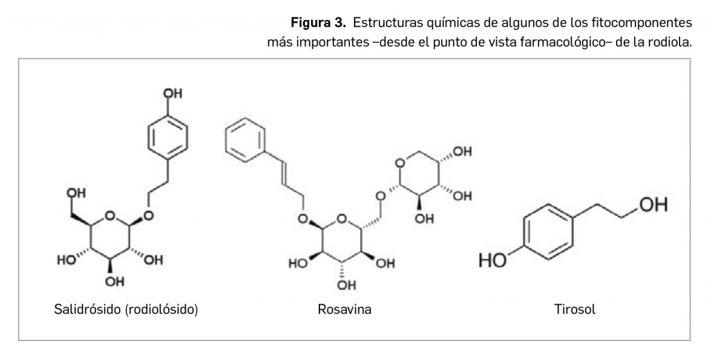 La parte empleada en terapéutica son las raíces y rizomas. La droga contiene un número elevado de principios activos (se han aislado más de cien), siendo mayoritarios los de tipo fenólico. Los principales (Figura 3) son: fenilpropanoides conocidos como rosavinas (rosavina, rosina, rosarina, etc.); derivados del feniletanol (salidrósido o rodiolósido, tirosol); monoterpenos (rosiridol, rosiridina); flavonoides (rodionina, rodiosina, rodiolina –este último es un flavonolignano–, etc.); ácidos fenólicos (ácido gálico y derivados, ácido clorogénico, hidroxicinámico, etc.); cumarinas; glucósidos cianógenos; y triterpenos (beta-sitosterol, daucosterol). Parece ser que el salidrósido se encuentra en todas las especies del género Rhodiola, mientras que las rosavinas son casi específicas de R. rosea. Los compuestos de mayor interés en lo que respecta a la actividad farmacológica de la droga son los fenilpropanoides y los derivados del feniletanol. Rosavinas y salidrósido se encuentran en una relación aproximada de 3:1.