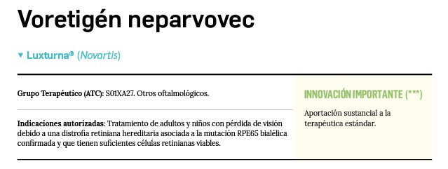 En resumen, se trata de un novedoso medicamento de terapia génica que representa una innovación farmacológica disruptiva por dos motivos principales: abre una vía terapéutica en términos de mecanismo de acción (restablecimiento de la función del epitelio pigmentario de la retina y detención de la muerte de células fotorreceptoras para atenuar la pérdida de visión) y aporta un beneficio clínicamente relevante en pacientes, en su mayoría niños o adolescentes, que hasta ahora no tenían ninguna opción de tratamiento autorizado en Europa para mejorar o recuperar su visión, abriendo incluso una puerta de esperanza a su curación con el progreso científico. Por tratarse del primer medicamento aprobado en su indicación, no puede realizarse en su posicionamiento ninguna comparación directa o indirecta con otra alternativa farmacológica, y se situará como elección preferente en primera línea. No obstante, se identifican algunos factores que pueden limitar su potencial uso o valor terapéutico: su administración se restringe a centros donde haya cirujanos experimentados en cirugía macular y la proporción de pacientes con distrofias hereditarias de la retina que puede beneficiarse del tratamiento es baja (solo en torno al 10% de todos los casos de amaurosis congénita de Leber y el 3% de los pacientes con retinosis pigmentaria presentan mutaciones bialélicas en el gen RPE65).