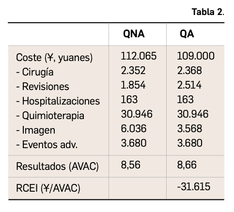 Los resultados de eficiencia, estimados mediante el ratio coste-efectividad incremental (RCEI) mostraron dominancia con la estrategia de QA, al presentar mejores resultados y menores costes (Tabla 2). Los análisis de sensibilidad determinísticos mostraron que el resultado del RCEI fueron muy sensibles al valor de la supervivencia general de la QNA. Los análisis probabilísticos estimaron que, para un umbral de 35.446 ¥/AVAC, la estrategia con QA presentaría una probabilidad del 54% de ser coste-efectiva.