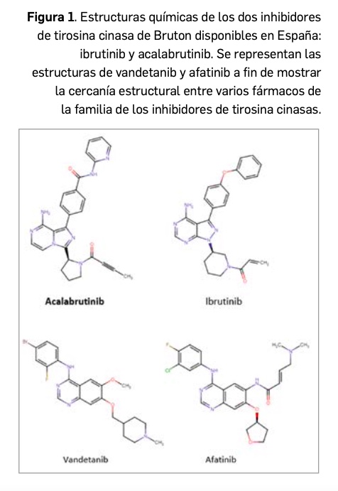 De forma similar a ibrutinib, con el que comparte una estrecha similitud estructural (Figura 1), se relaciona farmacológicamente también con afatinib y vandetanib. Es decir, se pueden vislumbrar ciertas características estructurales compartidas con otros miembros de la amplia serie de inhibidores de proteína cinasas, los cuales son el resultado de la optimización funcional mediante modelización molecular a partir de una serie de 2-fenilaminopirimidinas, de donde surgió imatinib, cabeza de serie del grupo. Todos ellos guardan –en mayor o menor grado– una familiaridad química con la molécula de ATP (o, en su caso, con la de GTP, como sucede en las cinasas MAPK), con la que compiten para provocar el bloqueo de la cinasa correspondiente.
