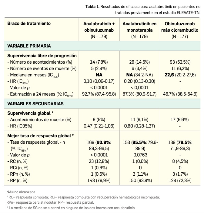 Uno de ellos (ELEVATE-IN) incluyó a pacientes adultos (N= 535 pacientes de ≥ 65 años o < 65 años con comorbilidades) con LLC naïve o no tratados previamente, quienes recibieron acalabrutinib con obinutuzumab, monoterapia de acalabrutinib, o bien una combinación de obinutuzumab y clorambucilo como grupo control (comparador activo). Tras una mediana de seguimiento de 28 meses, el tratamiento con el nuevo fármaco mostró una superioridad notable en términos de SLP en comparación con el control: sin haberse alcanzado la mediana en los brazos del fármaco (vs. 22,6 meses en el grupo control), la administración de acalabrutinib con o sin obinutuzumab redujo en un 90% y un 80% el riesgo de progresión o muerte por la enfermedad, respectivamente, alcanzándose estimaciones de SLP a 24 meses del 93% y del 87%. Esa eficacia fue consistente, e incluso mayor, en pacientes con factores citogenéticos de alto riesgo, como deleción de 17p, deleción de 11q, mutación de TP53 o IGHV no mutado, en quienes redujo el riesgo de progresión o muerte en un 87-92%. El beneficio con los regímenes a base de acalabrutinib sobre obinutuzumab+corambucilo se ve robustecido por la notable mejora en supervivencia global (reducción del riesgo de muerte del 40-53%) y la diferencia en las tasas de respuesta objetiva global (86-94% vs. 79%).