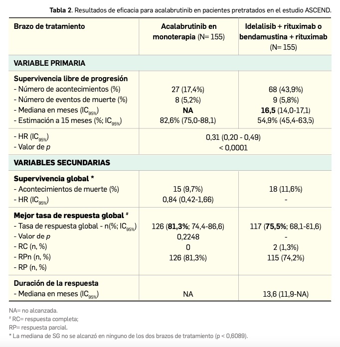 Una posterior evaluación por el investigador con un mayor periodo de seguimiento (mediana de 22,1 meses para acalabrutinib y 21,9 meses para los tratamientos usados como comparadores) demostró que la eficacia del fármaco se mantiene en el tiempo: la mediana de SLP no se alcanzó con acalabrutinib y fue de 16,8 meses para el grupo control, siendo el hazard ratio en la comparación entre grupos de 0,27 (IC95% 0,18-0,40), lo que supone una reducción del 73% en el riesgo de muerte o progresión para los pacientes asignados al brazo experimental.