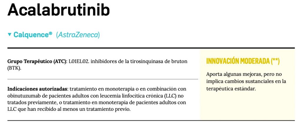 Acalabrutinib es un nuevo inhibidor potente y altamente selectivo de la tirosina cinasa de Bruton (BTK), una enzima que participa en la señalización bioquímica del receptor de antígenos y del receptor de citocinas de las células B, favoreciendo la supervivencia y proliferación de linfocitos B tumorales. Así, la inhibición covalente e irreversible que inducen acalabrutinib y su metabolito ACP-5862 sobre el centro activo de la enzima se traduce en una inhibición de la adhesión y migración dependiente de integrinas de linfocitos B, conducente a la reducción tumoral. El medicamento ha sido autorizado para el tratamiento por vía oral (100 mg/2 veces al día) en monoterapia o en combinación con obinutuzumab de pacientes adultos con leucemia linfocítica crónica (LLC) no tratados previamente, y para su uso en monoterapia en pacientes adultos con LLC que han recibido ≥ 1 tratamiento previo.