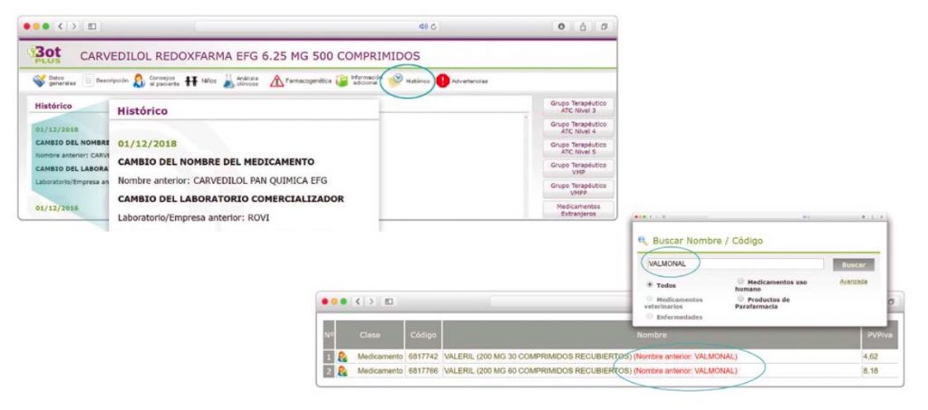Además de la información que se incluye en los listados mensuales publicados en PAM, en BOT PLUS se incluye un apartado de Histórico, en las fichas de medicamentos, en el que se presenta información referente a cambios que haya sufrido anteriormente el medicamento o producto, entre otros, los cambios de nombre y los cambios de laboratorio. Esta información también está disponible para productos sanitarios financiados o dietoterápicos.