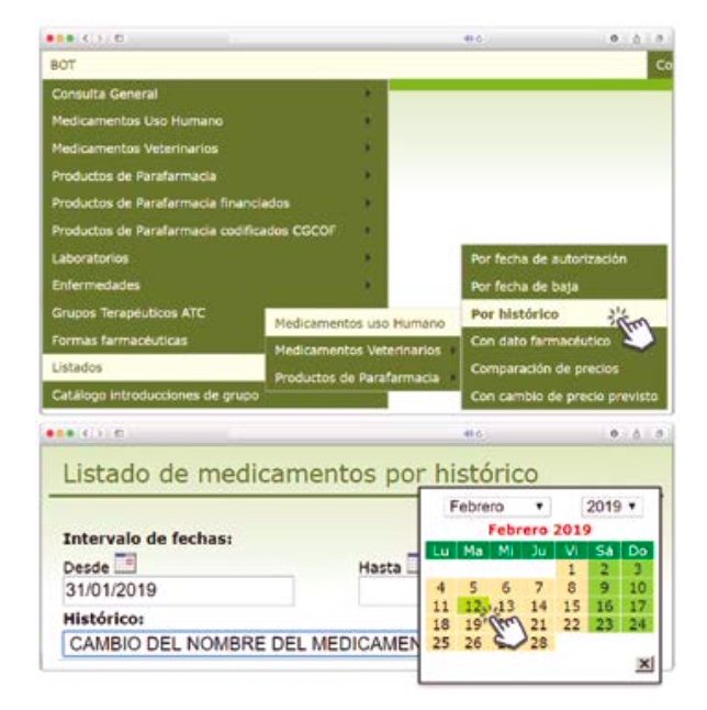 Además de la información existente en Histórico, se permite la explotación de la información incluida en BOT PLUS en este apartado, mediante la integración de la información almacenada en Histórico en el apartado de Listados de BOT PLUS, que permite realizar consultas entre rangos de fechas y por un concepto en concreto de entre los almacenados en el apartado de Histórico. Entre ellos se incluyen, precisamente, los conceptos “Cambio del nombre del medicamento” y “Cambio del laboratorio comercializador”.