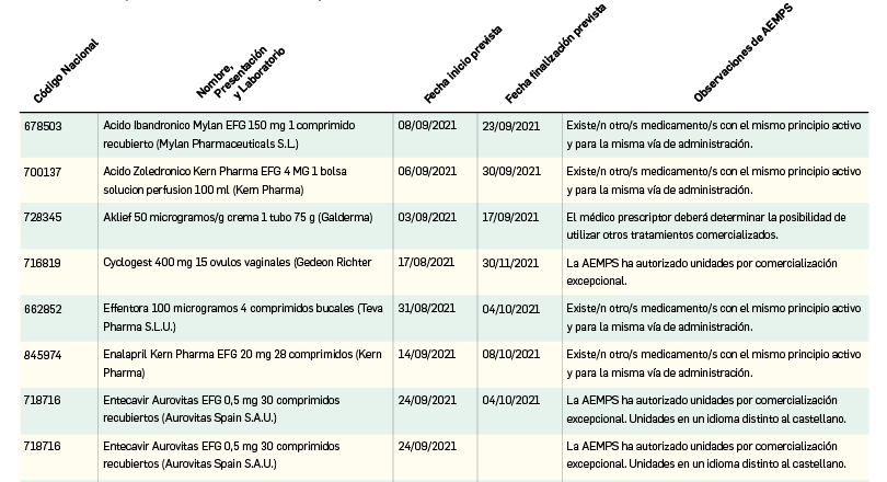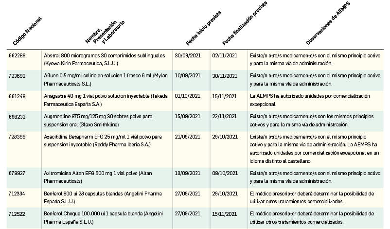 Listado de medicamentos con problemas de suministro publicado por la AEMPS, a fecha de cierre de este número. En BOT PLUS, se puede encontrar la información completamente actualizada, al tratarse de una información que varía de forma continua.