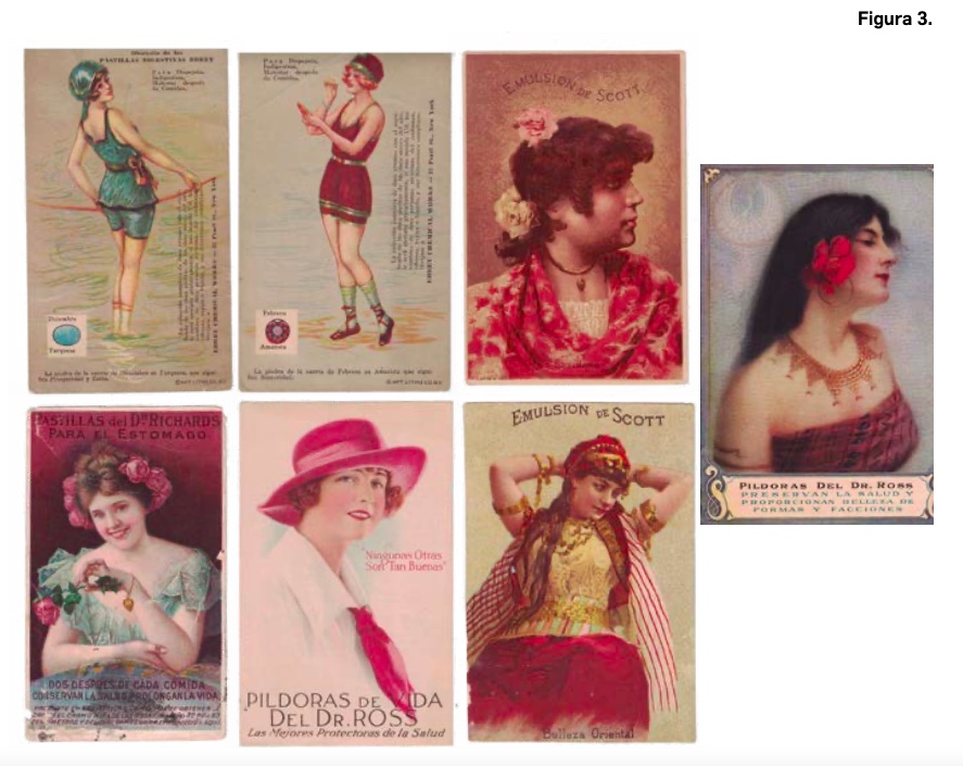 Lanman & Kemp de Nueva York, preparaba la zarzaparrilla y las píldoras de Bristol; la primera con muchas y muy antiguas utilidades terapéuticas y las segundas, también compuestas con vegetales, recomendadas para enfermedades del hígado, jaqueca, mareos y desarreglos biliosos. Eran publicitadas con imágenes de mujeres (11,5 x 7,5 cm) en representación de las estaciones del año. Tenemos la del invierno, el verano y el otoño (Figura 4).