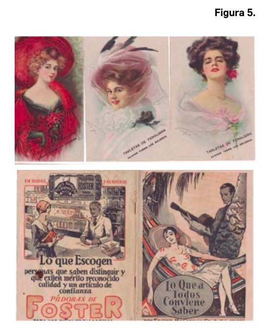 Junto a ellas otra postal de una bailarina de cancán (12 x 8 cm) para anunciar la nueva salud o salvación de la mujer por el Doctor Reno (Figura 2). Otro producto americano, con evidentes reminiscencias bíblicas, fabricado por Reno Chemical Co. en New Haven (Connecticut), registrado el 11 de diciembre de 1894 en los Estados Unidos de América y el 6 de julio de 1916 en La Habana4 , lo cual indica que también por esas fechas se comercializaría en España, privada todavía de registro de especialidades.