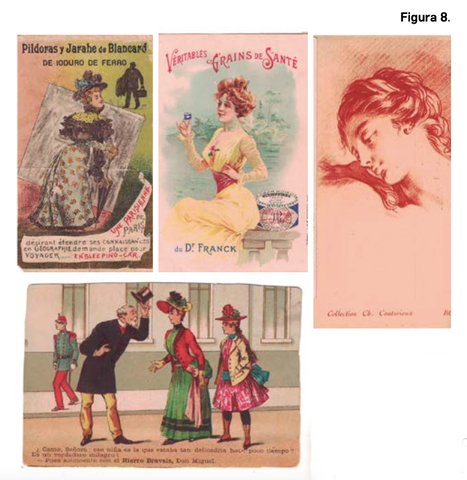 Junto a ellas, las píldoras y jarabe de Blancard de ioduro de hierro para la anemia, el raquitismo, úlceras y flores blancas o vaginitis producida por la bacteria gardnerella vaginalis, interrupción de las reglas, etc., que se producía en el nº 40 de la Rue Bonaparte de Paris, se anunciaba con el cromo (10,5 x 6 cm) de una parisién deseosa de viajar para aumentar sus conocimientos geográficos (Figura 8), sin relación alguna con el medicamento cuya composición, en todo caso, no parece le hiciera adecuado para tratar la vaginitis. Algunos estudiosos lo sitúan cronológicamente a finales del siglo XIX6.