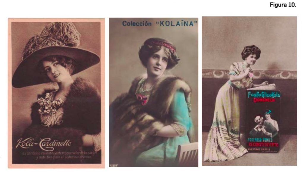 El Elixir Kolaína, ofertado con propiedades tónicas y reconstituyentes, efectuó una campaña propagandística poderosa. Se vendía en varias farmacias barcelonesas, en el resto de España e Hispanoamérica. La tarjeta postal de nuestra colección (14 x 9 cm) nos ofrece el retrato retocado de una joven aparentemente rica, plagada de visones, en estola y manguito, con una sonrisa entre lánguida y ligeramente ida, sentada en una especie de silla curul sin respaldo, lo cual la hace aparecer incómodamente inclinada hacia adelante (Figura 10).