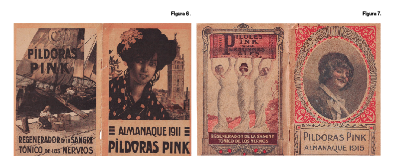 Las píldoras Pink se ofertaban para modificar la composición de la sangre y aumentar los glóbulos rojos, con acción sobre el sistema nervioso y capacidad de curar la anemia, clorosis, debilidad general, dolor de estómago, jaquecas, neuralgias, reumatismo y neurastenia, dedicado principalmente a las mujeres. En el almanaque de 1911, editado específicamente para su difusión (20,5 x 13 cm) aparece una sevillana junto a la Giralda en su portada (Figuras 6 y 7). En el de 1915, de idénticas medidas, se menciona (p.6) la dificultad de casarse para las mujeres continuamente enfermas y con mala cara. Para evitarlo, esas pastillas serían mano de santo; también servirían para la angustia padecida por las féminas de la cual se ofrecen testimonio de diversas curaciones, aunque para la neurastenia se nos proporciona el del jefe de estación de Torre del Campo (Jaén) y de otro cacereño (p.18) pese a lo cual, el folleto va encaminado fundamentalmente a las señoras.