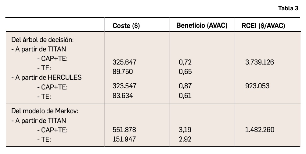 Al cabo de 5 años, los resultados del modelo con pacientes cuyo recuento era de ≥ 300 células/μl revelan que MEP resultó dominante respecto a BEN, al presentar un coste inferior y un resultado superior; asimismo, el resultado mostró dominancia de MEP respecto a RES en pacientes con recuento de ≥ 400 células/μl (Tabla 1).