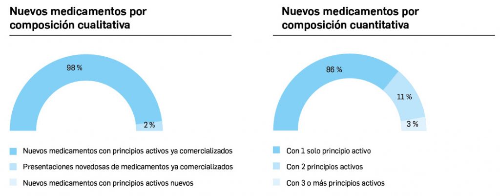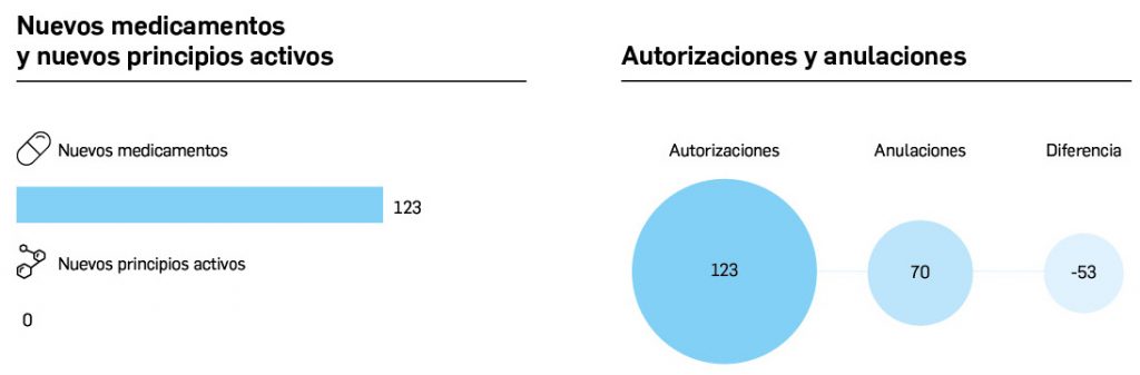 A nivel de volumen de medicamentos, hay que destacar que por quinto año consecutivo se reduce el número de presentaciones de medicamentos comercializadas, pues en 2021 se han comercializado 1.136 nuevas presentaciones –tanto de nuevos principios activos como de los ya existentes– frente a las 1.468 que se han dado de baja. A finales del año, el mercado de medicamentos en España contaba con aproximadamente 18.000 formatos o presentaciones comerciales de medicamentos. En la última década se han incorporado 9.373 presentaciones, lo que supone un 52% del total, y han desaparecido 10.498, con un balance negativo de 1.125 formatos.