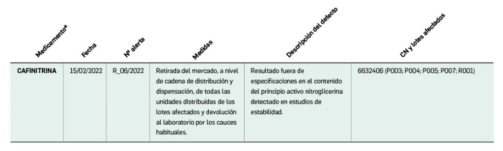 Alertas debidas a defectos de calidad observados en medicamentos de uso humano, publicadas por la AEMPS desde el anterior número y que suponen la retirada o inmovilización de ciertos lotes de medicamentos. En BOT PLUS puede encontrar más información detallada, con acceso al documento de la AEMPS.