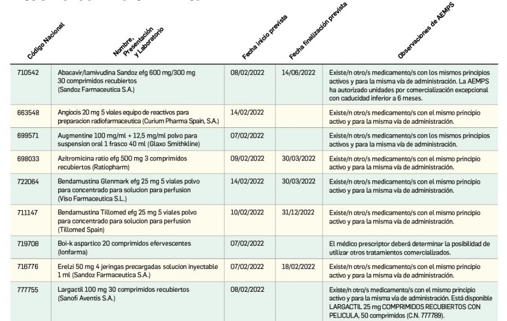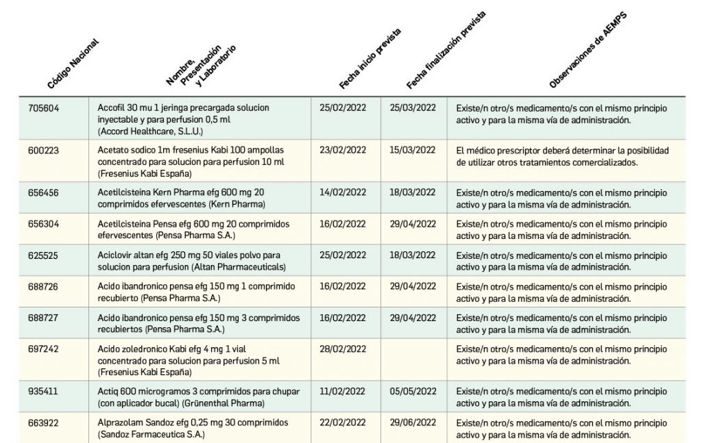 Listado de medicamentos con problemas de suministro publicado por la AEMPS, a fecha de cierre de este número. En BOT PLUS, se puede encontrar la información completamente actualizada, al tratarse de una información que varía de forma continua.