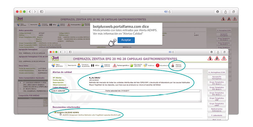 Además de los listados mensuales que podemos consultar en PAM, en BOT PLUS se incorpora la información que publica la Agencia Española de Medicamentos y Productos Sanitarios (AEMPS) relativa a notificaciones sobre seguridad y/o calidad de los medicamentos. Mediante un pictograma específico se pueden visualizar de forma rápida medicamentos afectados por alguna alerta de seguridad o de defectos de calidad, con tan solo entrar en su ficha.