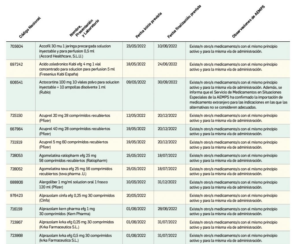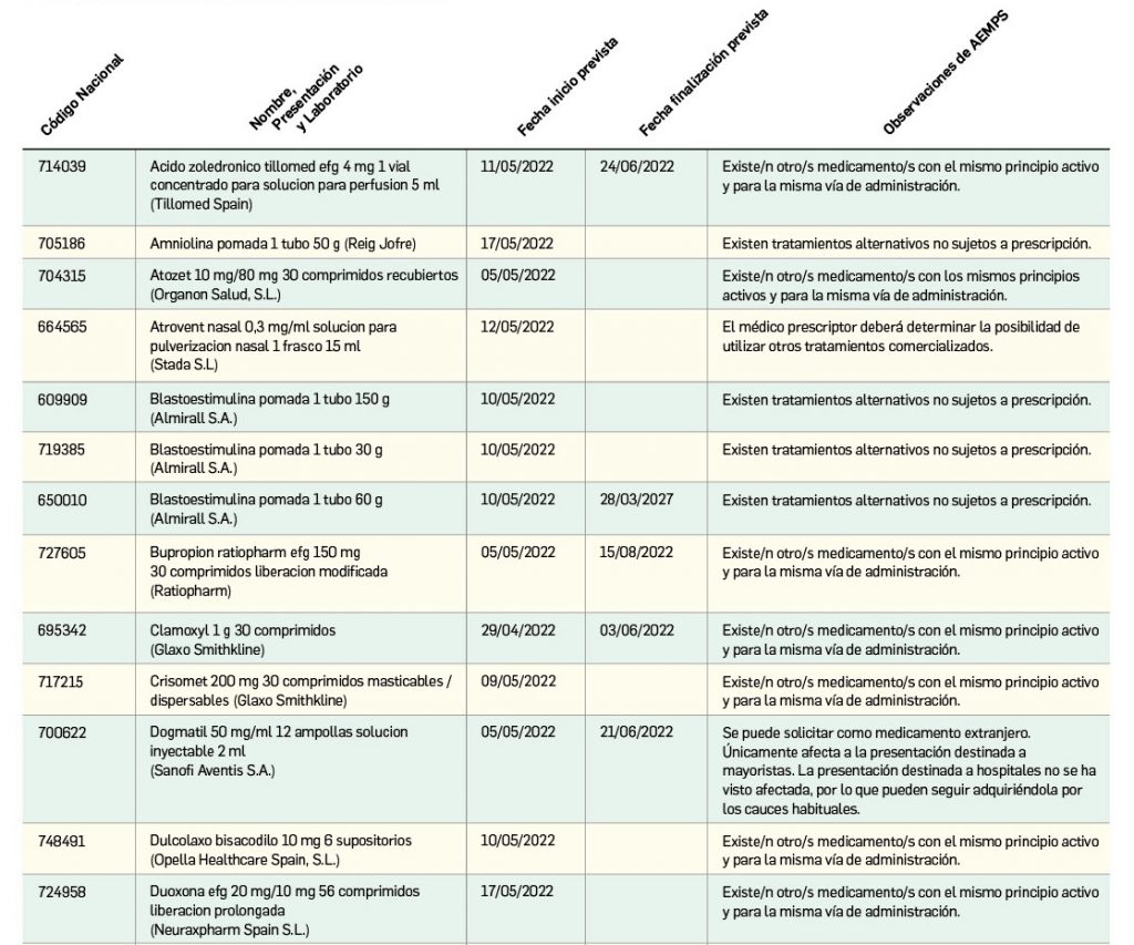 Listado de medicamentos con problemas de suministro publicado por la AEMPS, a fecha de cierre de este número. En BOT PLUS, se puede encontrar la información completamente actualizada, al tratarse de una información que varía de forma continua.