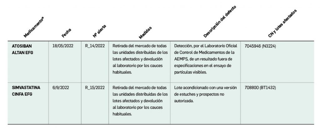 Listado de medicamentos con problemas de suministro publicado por la AEMPS, a fecha de cierre de este número. En BOT PLUS, se puede encontrar la información completamente actualizada, al tratarse de una información que varía de forma continua.