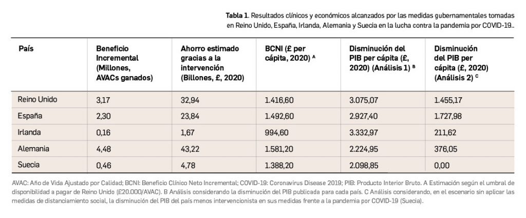En base a esta estrategia, Thom y colaboradores llevaron a cabo una comparativa de la gestión de la pandemia entre Reino Unido, España, Alemania, Suecia e Irlanda. Para cada país se evaluaron dos escenarios: en el primero se tomaron los casos de infección por SARS-CoV-2, hospitalizaciones y muertes publicados, desde el inicio de la pandemia hasta el 20 de julio de 2020; estos se compararon con un segundo escenario en el que se modelizó la transmisión del virus, los casos de hospitalización y las muertes ocasionadas si no se hubieran llevado a cabo las medidas de distanciamiento social. En ambos escenarios se cuantificó el coste asociado a cada episodio de hospitalización del paciente, considerando la frecuencia de hospitalización, los casos que requerían ingreso en UCI y la duración de la estancia, calculando un coste de £4.847 por episodio de hospitalización (4.358€ en 2020, según los datos del Banco Central Europeo). Con vistas a estimar el beneficio clínico neto incremental (BCNI) del distanciamiento social, en el análisis se incluyó exclusivamente el impacto de dicha estrategia sobre la COVID-19 (no se consideró el impacto del aislamiento sobre la salud mental). La eficacia se estimó como AVACs ganados; sin embargo, ante la ausencia de datos específicos sobre SARS-CoV-2, se asumió que el impacto de la infección por SARS-CoV-2 sobre la CVRS era equivalente al impacto de la infección por Influenza. Los AVACs fueron monetizados por medio del umbral de disponibilidad a pagar empleado en Reino Unido (£20.000/AVAC). Finalmente, el impacto económico de la pandemia se estimó mediante las variaciones de los PIB de cada nación en un análisis inicial (Análisis 1). Los resultados obtenidos para cada país fueron comparados entre sí.