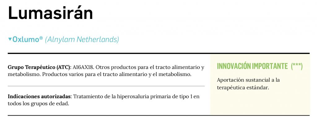 En resumen, el nuevo fármaco inaugura una vía terapéutica en una indicación para la que no se disponía de tratamientos farmacológicos aprobados. No representa una cura de la HP-1 (no proporciona una secuencia normal del gen alterado, sino que buscar reducir el sustrato y evitar el desvío metabólico a la síntesis de oxalato), pero permite combatir las manifestaciones clínicas de la enfermedad debidas a la acumulación de oxalato, con independencia del tipo de mutación en el gen AGXT. El IPT de la AEMPS posiciona a lumasirán como una alternativa terapéutica en aquellos pacientes pediátricos y adultos sin antecedentes de trasplante y con enfermedad renal leve o moderada que no responden a las opciones de tratamiento estándar, por su capacidad de reducir los niveles urinarios y plasmáticos de oxalato, lo cual podría reducir las comorbilidades asociadas a la enfermedad. Sin embargo, los datos disponibles son por ahora escasos, y habrá que esperar a los procedentes de los ensayos en marcha para definir mejor su eficacia y seguridad a largo plazo.