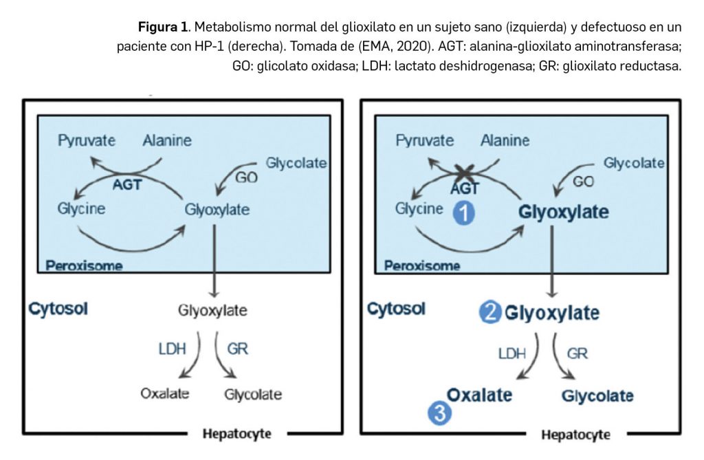 La hiperoxaluria primaria (en adelante, HP) es una enfermedad genética, de herencia autosómica recesiva, desarrollo progresivo y potencialmente mortal, que se produce por un error innato en el metabolismo resultante en una producción hepática de oxalato anormalmente incrementada. La acumulación tóxica de ese metabolito es la causa responsable de las manifestaciones clínicas de la enfermedad. De entre los tres tipos identificados de HP, el mayoritario es el tipo 1 (80%), que además es la forma clínica más grave.