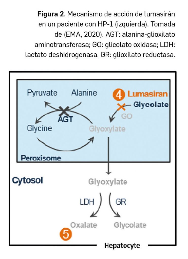 De modo interesante, el mecanismo de acción de lumasirán es independiente de la mutación del gen AGXT subyacente, habida cuenta de que la enzima glicolato oxidasa está por encima en la ruta metabólica de la alanina-glioxilato aminotransferasa deficiente, causa primaria de la HP-1 (Figura 2).