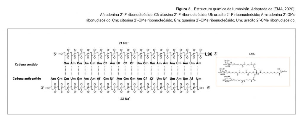 Según se ha avanzado, lumasirán es una molécula de ARN pequeño de interferencia (siRNA) formada por una doble hélice que está unida covalentemente a 3 residuos de N-acetilgalactosamina, la cual se conjuga con la cadena sentido del ARN y es la que permite la liberación selectiva del fármaco en el hígado a través de la captación por los receptores de asialoglicoproteína4. Estos receptores se expresan mayoritaria y abundantemente (0,5-1 millón por célula) en la superficie de los hepatocitos y favorecen la posterior endocitosis del fármaco mediada por receptor.