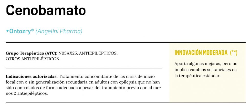 En definitiva, los adultos con crisis de inicio focal farmacorresistentes –que no hayan conseguido un control adecuado o no toleren al menos 2 líneas previas (una primera monoterapia y una segunda con otra opción de monoterapia o con una primera adyuvancia)– se podrán beneficiar del uso diario por vía oral de cenobamato como alternativa en una 3ª línea de tratamiento como primera o segunda adyuvancia; muy probablemente, tras el uso de un antiepiléptico de 3ª generación (como brivaracetam, perampanel, eslicarbazepina o lacosamida). Cenobamato no incorpora un mecanismo de acción novedoso en la indicación ni parece suponer un cambio de paradigma en el abordaje de la epilepsia, pero sí va a cubrir una laguna terapéutica por tratarse del primer medicamento específicamente autorizado para el tratamiento concomitante tras el fallo de 2 o más fármacos. Su lenta titulación y el hecho de no estar disponible en formulación intravenosa impiden su empleo en situaciones de urgencias.