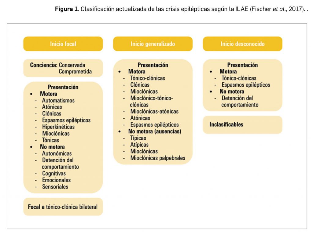 Desde un punto de vista clínico, las manifestaciones del cuadro epiléptico se relacionan con la localización anatómica del foco epiléptico y su extensión, y pueden ir desde un leve tic o un breve paréntesis en la atención del paciente a una crisis convulsiva generalizada, de varios minutos de duración. La ILAE clasifica las crisis epilépticas en función de la zona cerebral en que se originan y la forma de presentación –sintomatología motora y nivel de conciencia– en tres grandes grupos: de inicio focal, de inicio generalizado o de inicio desconocido (Figura 1).