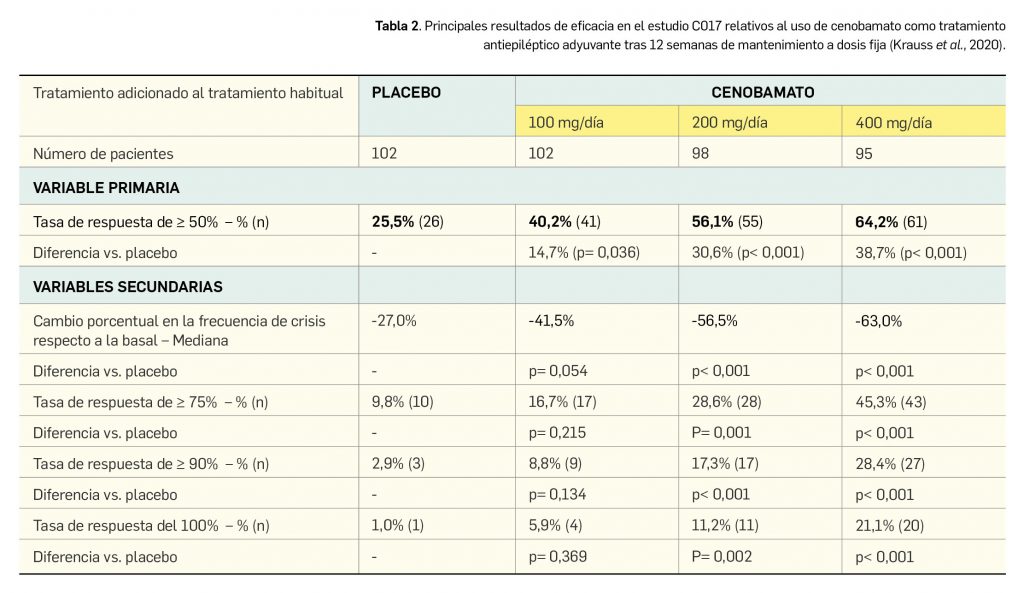 Los datos clínicos que sustentaron su aprobación proceden fundamentalmente de un estudio pivotal aleatorizado de fase 2 (N= 437), de búsqueda de dosis y controlado por placebo, en que cenobamato se adicionó a la terapia previamente establecida. Sus resultados probaron que, tras un periodo inicial de 6 semanas de titulación y otras 12 semanas de mantenimiento a dosis fija, la tasa de respuesta con cenobamato –reducción de la frecuencia de crisis ≥ 50%7– fue notablemente más alta que con placebo: 56% con la dosis de 200 mg/día y 64% con 400 mg/día (dosis máxima), frente a una tasa del 27% con placebo; hasta el 11% y el 21% de pacientes se mantuvieron libres de crisis con ambos niveles de dosis (vs. 1% con placebo). De modo interesante, se vio que las dos dosis citadas de cenobamato reducían sustancialmente la incidencia de crisis con alteración del nivel de conciencia y de crisis focales que progresan a bilaterales tónico-clónicas (las más graves). La eficacia del fármaco se mostró consistente en los distintos subgrupos de pacientes, con independencia del tratamiento previo y concomitante, y se mantenía en el tiempo: se observaron resultados similares tras al menos 25-30 meses de mantenimiento en la fase de extensión abierta (reducción de la frecuencia de crisis del 76%, con un 20% de los pacientes libres de crisis).
