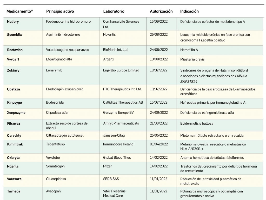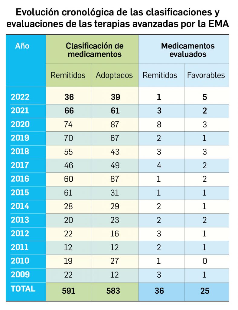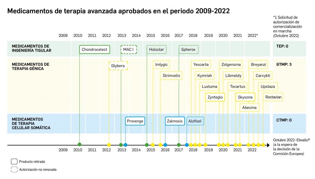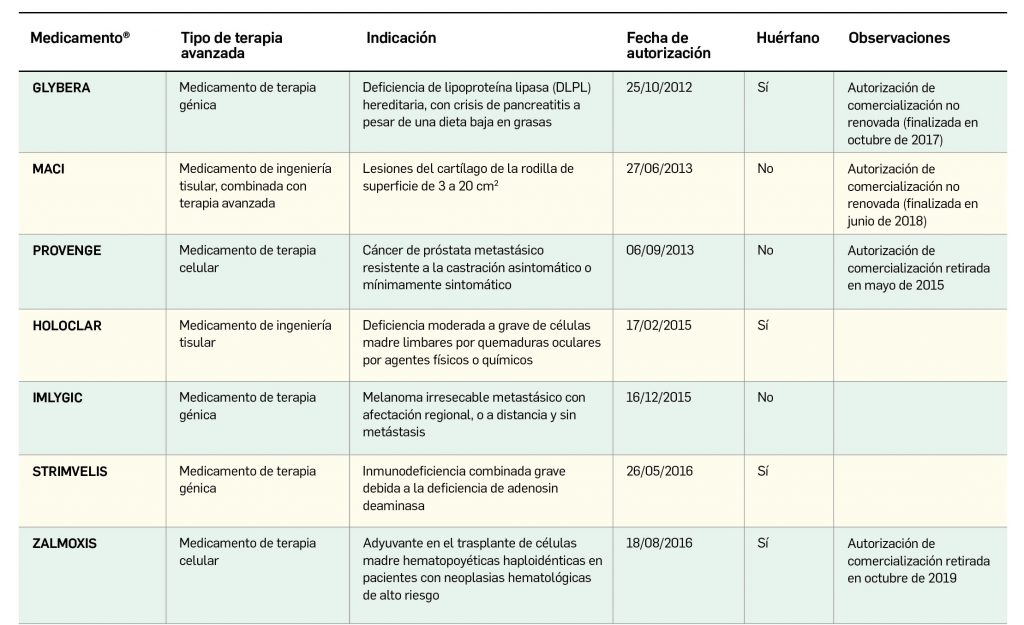 La siguiente tabla recoge los medicamentos de terapia avanzada que han recibido autorización de comercialización en la UE durante en los últimos 10 años (2012-2022).