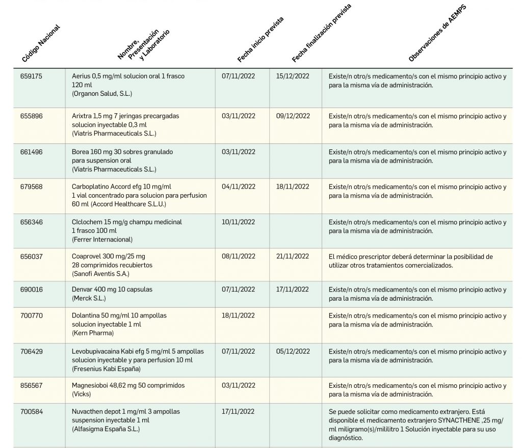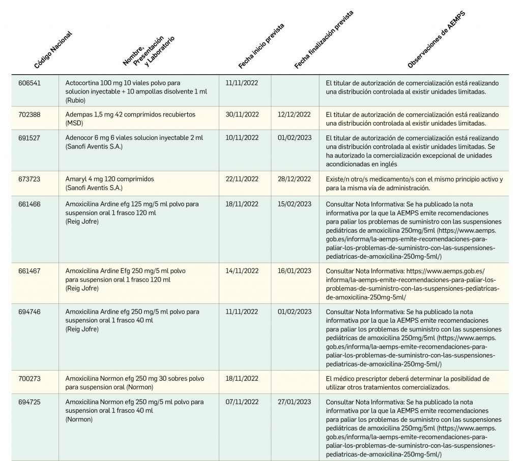 Listado de medicamentos con problemas de suministro publicado por la AEMPS, a fecha de cierre de este número. En BOT PLUS se puede encontrar la información completamente actualizada, al tratarse de una información que varía de forma continua.