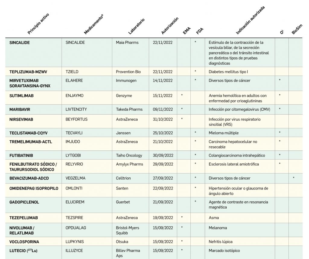 La siguiente tabla recoge los medicamentos de terapia avanzada que han recibido autorización de comercialización en la UE durante en los últimos 10 años (2012-2022).