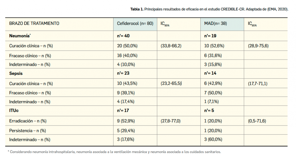 En el caso del estudio de fase 3 CREDIBLE-CR, que analizó la eficacia de cefiderocol respecto a la mejor alternativa disponible, los resultados obtenidos en ambos brazos de tratamiento respecto a la proporción de pacientes con neumonía o sepsis que alcanzó la curación clínica en el día 7 tras el final del tratamiento fueron similares (aproximadamente 50% y 43%, respectivamente). En el caso de la erradicación microbiológica en pacientes con ITUc, también en el día 7 tras finalizar el tratamiento, la proporción fue superior en el brazo de cefiderocol (53% vs. 20%), pero el diseño descriptivo del estudio no permite concluir sobre la significación de estos resultados. Además, el número de pacientes finalmente incluido en cada subgrupo de tratamiento fue muy reducido, lo que limita aún más la posibilidad de extraer conclusiones respecto a la eficacia de cefiderocol. También resulta alarmante el dato de mortalidad, superior en el brazo de cefiderocol (34% vs. 18%), especialmente en los pacientes con infección por A. baumannii y que podría relacionarse con una baja actividad antibiótica de cefiderocol frente a este microorganismo o con fenómenos de heterorresistencia ocurridos durante el tratamiento. La mortalidad observada en infecciones causadas por otros patógenos fue similar a la de otros tratamientos ya disponibles (AEMPS, 2023).